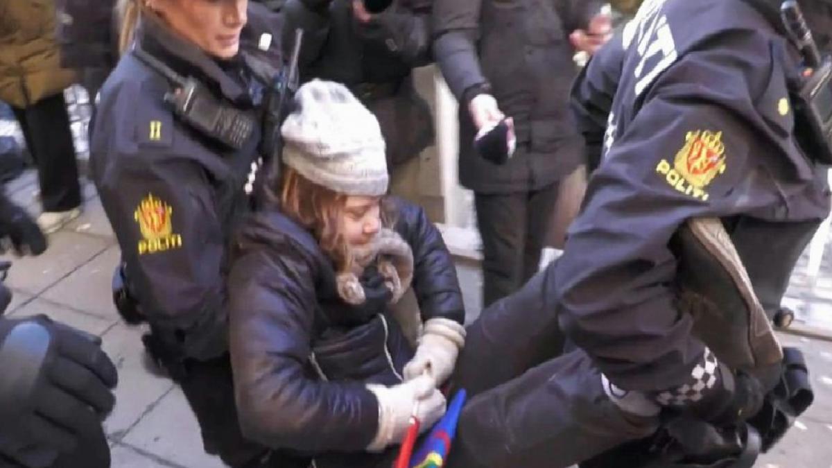 Çarşamba günkü video görüntüleri gösteriyor ki polis Sami bayrağıyla Thunberg'i Maliye Bakanlığı girişinden uzaklaştırdı. Protestocular ilahiler söylerken, o yakınlarda yere indirildi. Başka bir girişte protestoculara katılmaya çalıştıktan sonra yine uzaklaştırıldı.